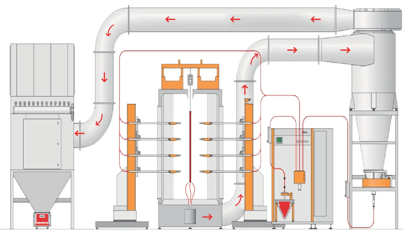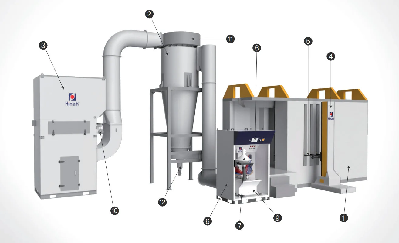 To prevent powder overflow, the air in the spray room passes through filter elements, forming a controlled outward airflow. To prevent blockage, an automatic pulse cleaning system periodically releases bursts of air to clear the surface of the filter. This ensures the air duct remains unobstructed and the recycling system maintains peak performance.